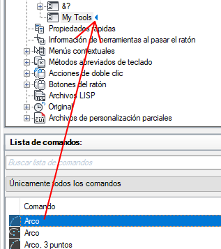 En el panel Lista de comandos, arrastre un comando al menú desplegable o a una ubicación del menú desplegable en el panel Personalizaciones en <nombre de archivo>.