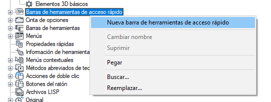 - En la ficha Personalizar, en el panel Personalizaciones en <nombre de archivo>, haga clic con el botón derecho en el nodo Barras de herramientas de acceso rápido. Haga clic en Nueva barra de herramientas de acceso rápido.