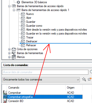 - En el panel Lista de comandos, arrastre el comando o el control que desee añadir a la barra de herramientas de acceso rápido del panel Personalizaciones en <nombre de archivo>.