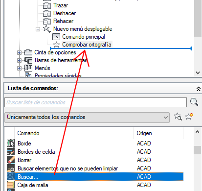 - En el panel Lista de comandos, arrastre el comando o el control que desee añadir al menú desplegable del panel Personalizaciones en <nombre de archivo>.