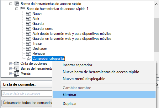 - Haga clic con el botón derecho del ratón en el comando que desee eliminar y clic en Eliminar de Barra de herramientas de acceso rápido.