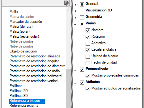 Control de la visualización de las propiedades personalizadas y los atributos para las referencias a bloque