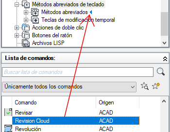 - Para crear un método abreviado, vaya al panel Lista de comandos y arrastre un comando al nodo Métodos abreviados del panel Personalizaciones en <nombre de archivo>.