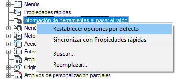1. En la ficha Personalizar, en el panel Personalizaciones en <nombre de archivo>, haga clic con el botón derecho en Información de herramientas al pasar el ratón.