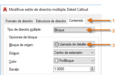 Por ejemplo, para crear un estilo de tipo "llamada de detalle", inicie el comando ESTILDIRECTRIZM. En el Administrador de estilos de directriz múltiple, haga clic en Nuevo y elija un nombre descriptivo para el nuevo estilo de directriz múltiple. Haga clic en la ficha Contenido, seleccione Bloque y, a continuación, Llamada de detalle, como se muestra.