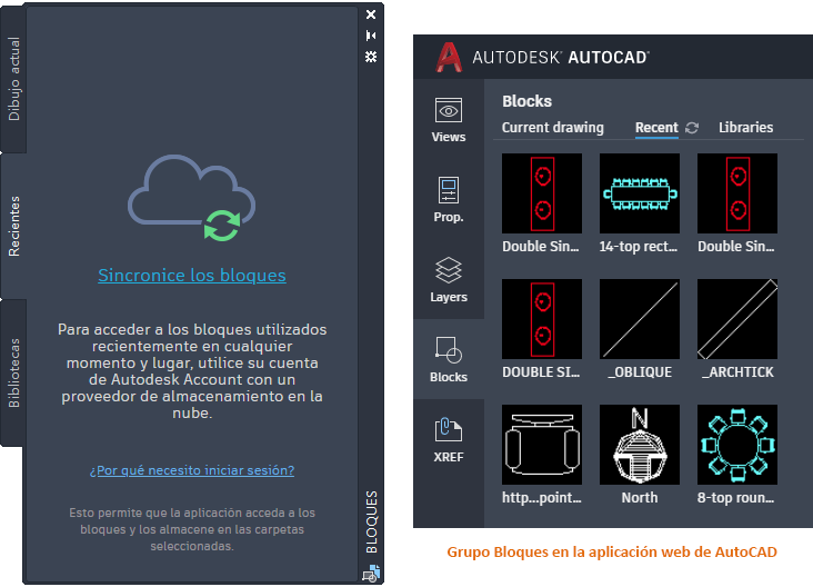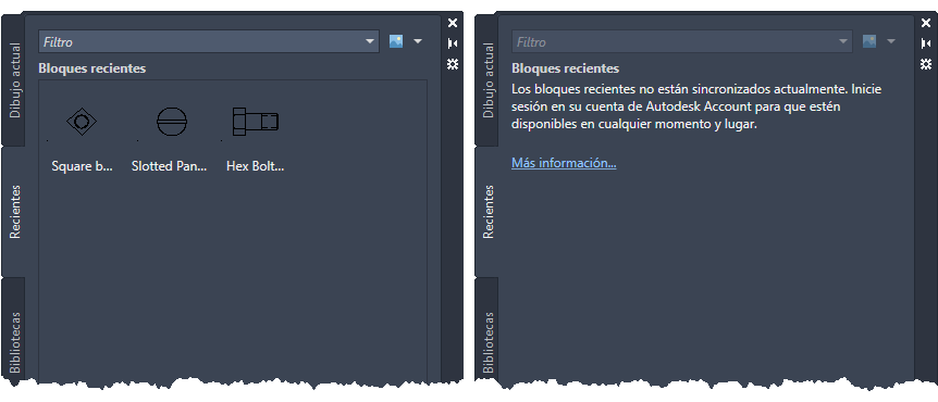 Es posible que la opción Sincronice los bloques no se muestre en la paleta de bloques si ya hay bloques recientes en el dibujo actual o si no ha utilizado la paleta de bloques para iniciar sesión en su cuenta de Autodesk Account.