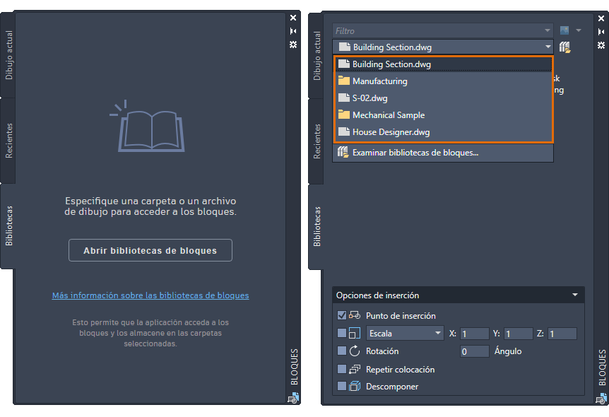 Se ha cambiado el nombre de la ficha Otros dibujos de la paleta de bloques a Bibliotecas. Ahora puede especificar una carpeta, un archivo de dibujo o cualquier definición de bloque almacenada en un dibujo para insertarla como bloque en el dibujo actual. La ficha Bibliotecas incluye una lista desplegable que muestra las cinco bibliotecas de bloques utilizadas más recientemente (archivo de dibujo o carpeta) para agilizar el acceso. Si elige una biblioteca de bloques en una ubicación de almacenamiento en la nube, puede utilizar los mismos bloques en la aplicación web de AutoCAD.