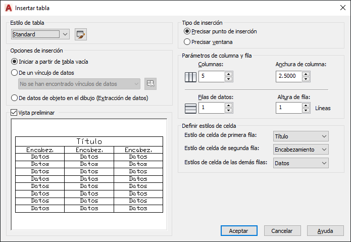 Controla si se muestra una vista previa. Si comienza a partir de una tabla vacía, la vista previa mostrará un ejemplo del estilo de tabla. Si crea un vínculo de tabla, la vista previa mostrará la tabla resultante. Si desea mejorar el rendimiento al trabajar con tablas grandes, desactive esta opción.