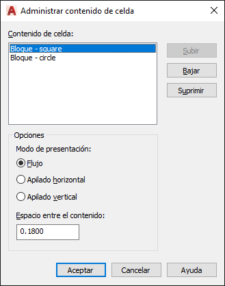 Muestra todos los textos o bloques de la celda seleccionada por orden de aparición. El texto se indica con la etiqueta Texto de celda de tabla. Los bloques se marcan con Bloque delante del nombre del bloque.