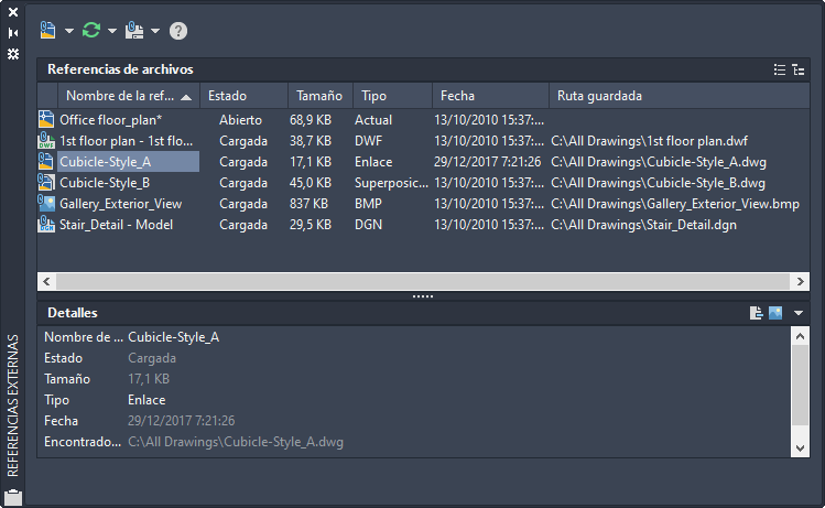 Muestra una lista de las referencias del dibujo actual, incluida información como, por ejemplo, el estado, el tamaño y la fecha de creación.