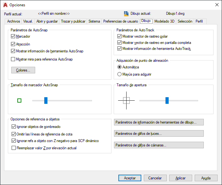 Permite establecer opciones de varias funciones de edición, incluidas AutoSnap y AutoTrack.