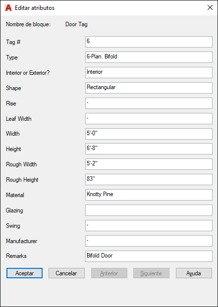 Indica el nombre del bloque seleccionado. El valor de todos los atributos incluidos en el bloque se muestra en este cuadro de diálogo.