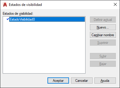 Enumera los estados de visibilidad disponibles para la definición de bloque dinámico actual. El orden de esta lista se refleja en la referencia a bloque dinámico al hacer clic en un pinzamiento para mostrar la lista de estados de visibilidad. El estado que se encuentra en el primer puesto de la lista es el estado por defecto para la referencia a bloque.