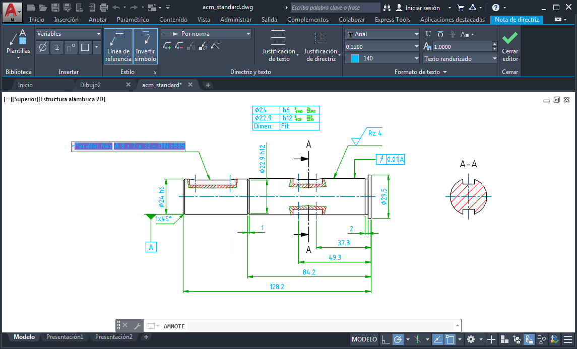 La ficha contextual de la cinta de opciones se muestra a medida que se designan puntos para los vértices de la directriz. Un editor in situ le permite especificar el texto de la nota de igual forma que especifica el texto con el comando TEXTOM. Todas las funciones que estaban disponible con el cuadro de diálogo Símbolo de nota están disponible con la nueva ficha contextual. Si desea continuar utilizando el cuadro de diálogo Símbolo de nota, puede desactivar la ficha contextual estableciendo la variable de sistema AMNOTETAB a 0.