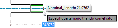 Cuando se inserta el contenido en un dibujo, AutoCAD Mechanical solicita que se "arrastre el tamaño". También muestra el nombre de la restricción dimensional en una información de herramientas. Si la entrada de cotas está activada, se puede introducir el valor de cota en la información de herramientas correspondiente.