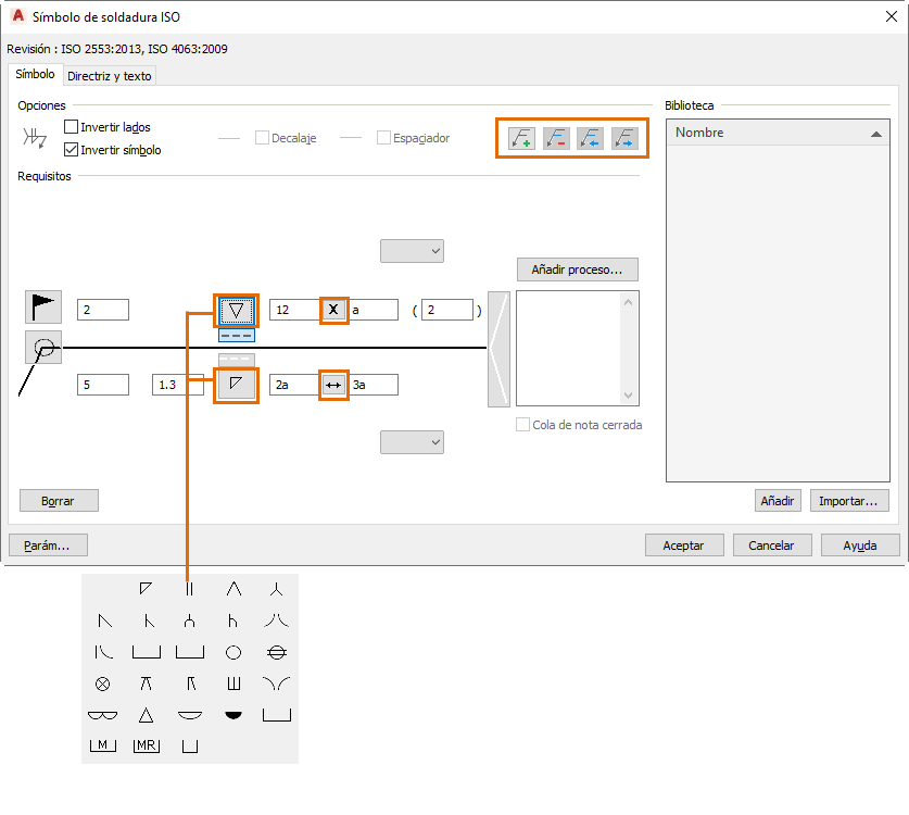 El símbolo de soldadura se ha actualizado en el conjunto de herramientas AutoCAD Mechanical 2021 para admitir las últimas revisiones de las normas ISO y DIN (ISO 2553:2013 y DIN EN ISO 2553:2014). Los cambios incluyen la revisión de los símbolos elementales y complementarios, así como la nueva notación de soldadura (distancia entre dos puntos). La admisión de líneas de referencia múltiple también se añade a la última revisión.