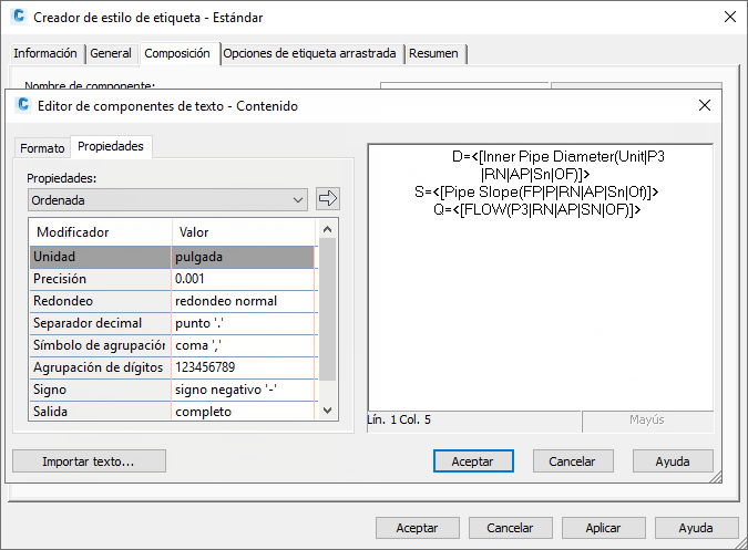El siguiente paso consiste en crear un estilo de etiqueta de tubería para la planta y el perfil que muestre este valor de caudal. En la figura 12 se muestra un ejemplo de este estilo de etiqueta, con los parámetros hidráulicos correspondientes:
