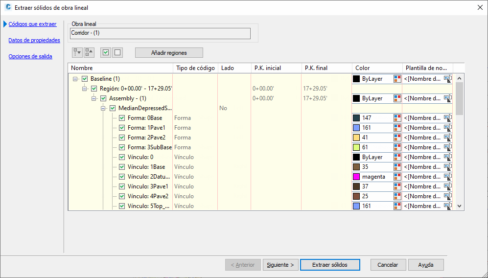 Nota: Si opta por extraer cuerpos de AutoCAD de una obra lineal, se usan formas y vínculos para generar un modelo que coincida con la forma en que se construye la obra lineal. Si bien los cuerpos de AutoCAD son similares a los sólidos de AutoCAD desde un punto de vista visual, la extracción de cuerpos tiene varias limitaciones. Por ejemplo, en los cuerpos de AutoCAD no funciona algunas funciones como calcular las propiedades másicas.