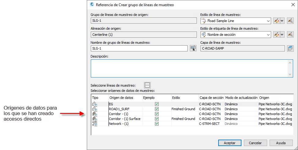 Durante este proceso no se muestran cuadros de diálogo individuales para crear referencias de accesos directos a datos. Los ajustes por defecto que se utilizan para crear las referencias pueden especificarse antes de utilizar el comando Crear referencia de grupo de líneas de muestreo mediante la configuración de comando correspondiente, como CreateSurfaceReference, CreateProfileReference, CreateNetworkReference y CreateCorridorReference.
