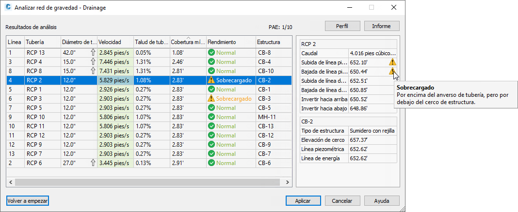 Utilice el comando Analizar red de gravedad para ajustar el tamaño de tuberías y restablecer rasantes, y para calcular las líneas de energía y las líneas piezométricas conforme a la norma HEC-22.