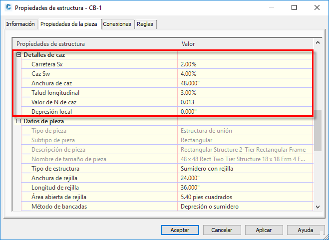 Puede utilizar la sección Detalles de caz del cuadro de diálogo Propiedades de estructura para definir las propiedades de la zona de la carretera alrededor del sumidero. Se utilizan con el comando Analizar red de gravedad para cálculos de análisis de sumideros.