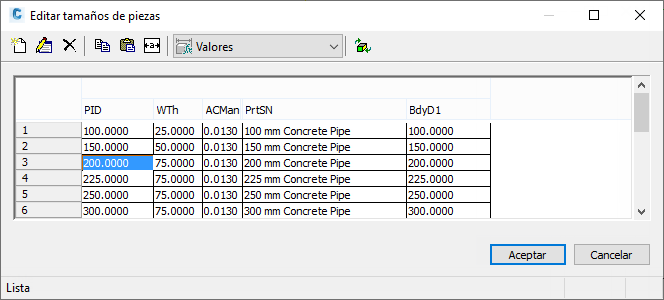 - Para modificar los valores de tamaños de tuberías, seleccione la fila y la celda de tamaño. Haga doble clic para editar.