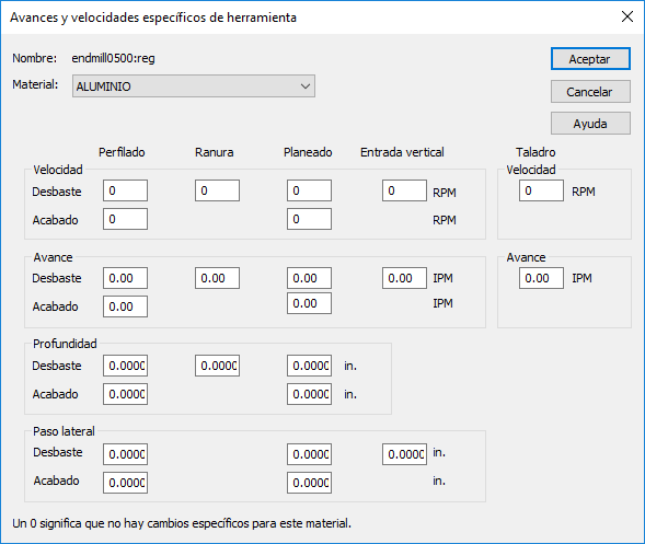 - Cambie los valores de Avance, Velocidad, Profundidad (de corte) y Paso lateral que desee y haga clic en Aceptar.
