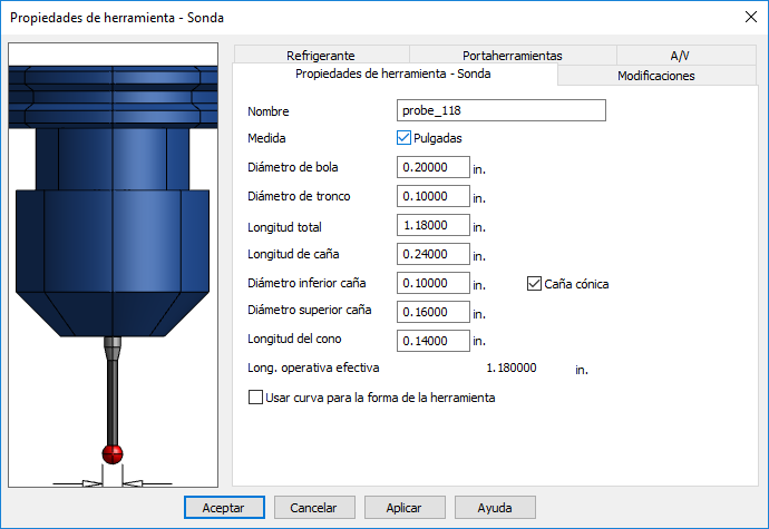 Medida — Indica las unidades utilizadas para representar las dimensiones de la herramienta. Seleccione Pulgadas para las pulgadas o desactive para seleccionar milímetros.