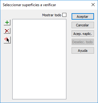 Para abrir el cuadro de diálogo de Seleccionar superficies a verificar, haga clic en Superf. a verificar en la pestaña de Dimensiones del cuadro de diálogo de Propiedades de figura de fresado.