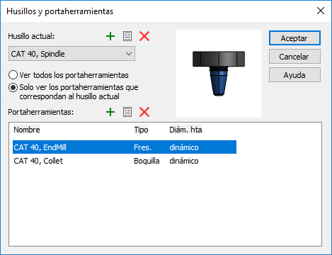 Utilice el cuadro de diálogo de Husillos y portaherramientas para ver, modificar y crear husillos y portaherramientas.