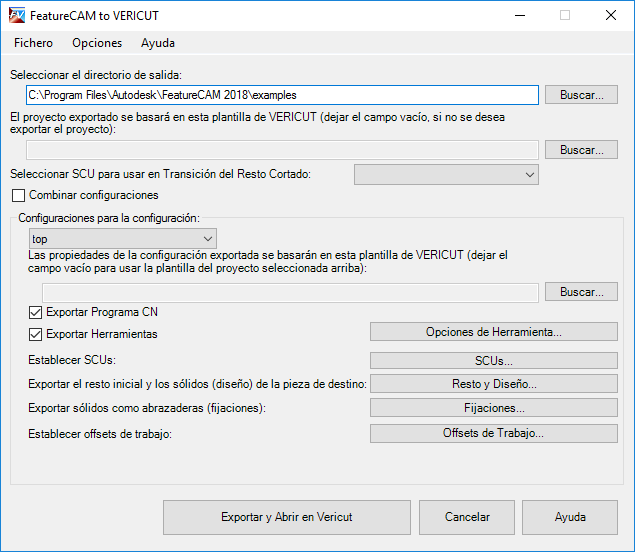 Utilice el cuadro de diálogo de FeatureCAM To VERICUT para configurar las opciones de exportación como proyectos Vericut de los documentos de fresado o torno/fresa: