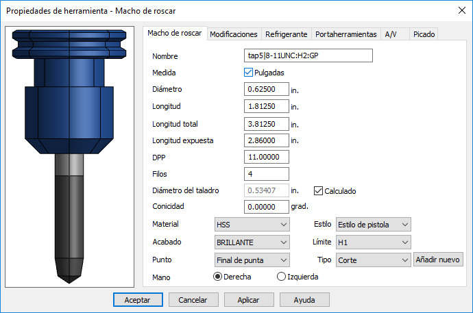 Punta — Los machos de roscar de Final plano terminan en plano y los de Final de punta terminan en punta. Si se requiere un macho de roscar de final plano para un agujero ciego, se genera un mensaje de aviso en la hoja de operaciones. Independientemente del tipo de herramienta que se utilice para el roscado, es necesario que el agujero tenga suficiente distancia de seguridad para el roscado. Cuando el agujero no cumple este requisito, se genera un mensaje de error al introducir las dimensiones del agujero.