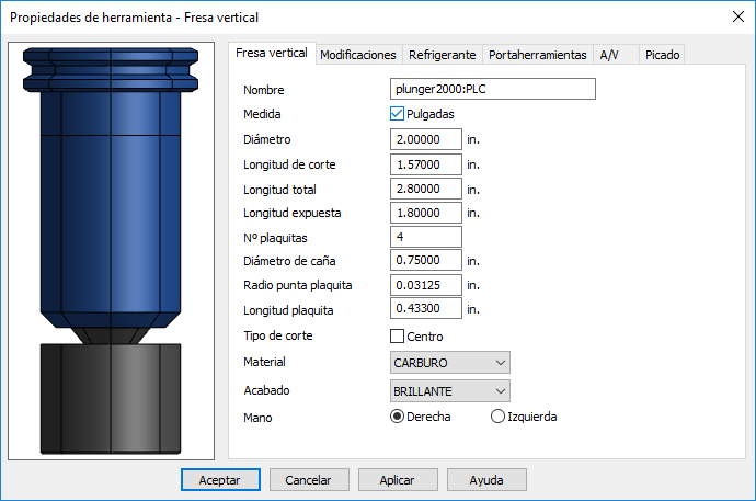 Material — Indica de qué está hecha la herramienta. Esta información es relevante a la hora de calcular los avances y las velocidades.