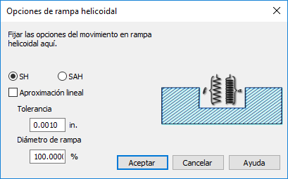 Seleccione la dirección para la rampa helicoidal entre SH (sentido horario) o SAH (sentido antihorario).
