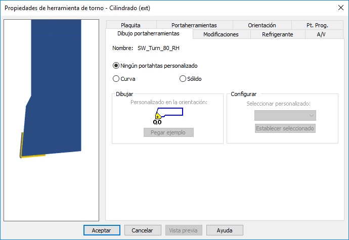 Seleccione una curva en la lista de Seleccionar personalizado y haga clic en Establecer seleccionado para guardarla. La curva se guarda en la base de datos de utillaje, independiente del fichero de pieza. Cualquier uso posterior de la herramienta en ficheros de pieza utiliza este portaherramientas personalizado.
