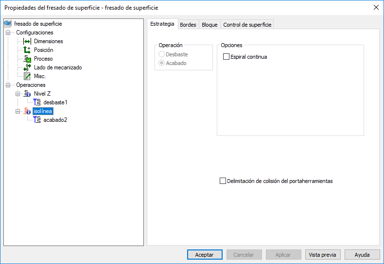 Espiral continua — Active esta opción para detener la levantada de herramienta de la superficie durante el mecanizado.