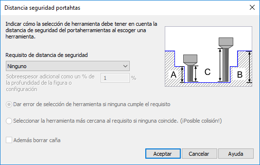 Para abrir el cuadro de diálogo de Distancia seguridad portahtas, haga clic en Dist. seguridad portahtas en la página de Selección de herramienta del cuadro de diálogo de Atributos de mecanizado.