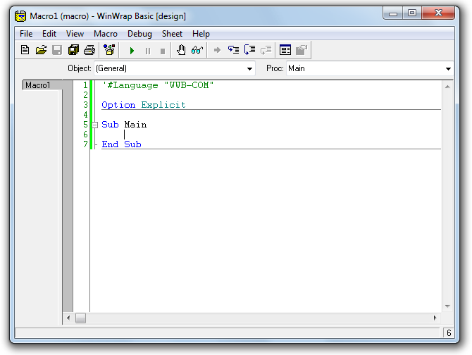5. Seleccione el complemento al que desea acceder y haga clic en Abrir. El complemento se abre en el modo de diseño, que permite leer y editar el código BASIC. Los comentarios van precedidos del carácter '.