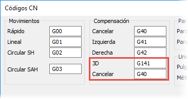 La compensación de herramienta 3D se aplica únicamente a operaciones de acabado y a movimientos lineales. Las entradas en arco se aproximan con movimientos lineales cuando se ha seleccionado compensación de herramienta 3D en la figura. Las palabras clave de compensación de XBUILD (<COMP-STAT>, <COMP-START>, etc) funcionan tanto para la compensación de herramienta 2D como para la 3D (únicamente puede haber un tipo de compensación activa). Configure los códigos CN para que activen y desactiven la compensación de herramienta 3D en el cuadro de diálogo de Códigos CN en XBUILD: