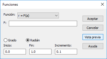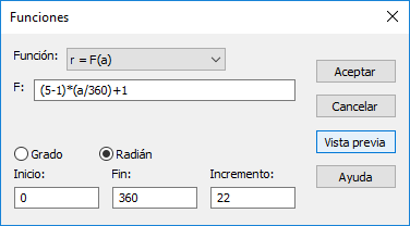 Vista previa — Genera la curva y la visualiza para poder revisarla, pero no aplica la función generada al dibujo como geometría. Dependiendo de los puntos inicial y final y del incremento, es posible que la evaluación y construcción de la vista previa se demoren unos momentos.