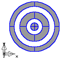 La posibilidad de tener varias curvas en la superficie de recubrimiento o tapa permite anidar curvas dentro de otras curvas. En función de la dirección de la curva, es posible incluir cortes y superficies sin cortes en una operación. En el siguiente ejemplo, la parte gris del patrón de ojo de buey contiene superficies, mientras que los anillos sin colorear no las tienen. Utilice Vista previa para que las direcciones de las curvas sean las correctas antes de cerrar el cuadro de diálogo.