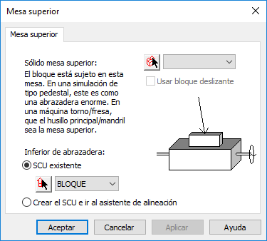El sólido de la mesa superior es el sólido al que se conectan el bloque y las abrazaderas. Es decir, en la simulación de máquina, el bloque y las abrazaderas se mueven junto con el sólido seleccionado en este cuadro de diálogo como si fueran dispositivos secundarios de tal sólido.