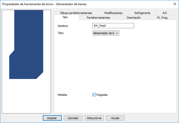 Medida — Indica las unidades utilizadas para representar las dimensiones de la herramienta. Seleccione Pulgadas para las pulgadas o desactive para seleccionar milímetros.