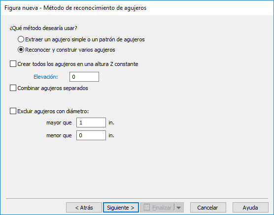 Excluir agujeros con diámetro — Ignore agujeros fuera del rango del tamaño especificado. Solo está disponible en RAF.