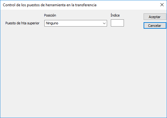 Utilice el cuadro de diálogo para determinar la Posición y el Índice que desea utilizar en cada puesto de herramienta en la máquina durante el manejo de piezas.