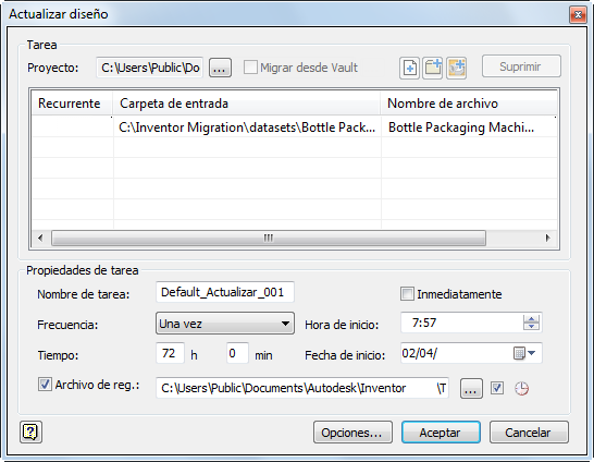El Programador de tareas genera un archivo de registro que recoge los archivos que se han migrado correctamente y los que no. El archivo está en formato ASCII (.txt) y se encuentra por defecto en C:\Mis documentos\Inventor <versión>\Task Scheduler\Log & Report Files o C:\Usuarios\Acceso público\Documentos\Autodesk\Inventor <versión>\Task Scheduler Logs & Reports.