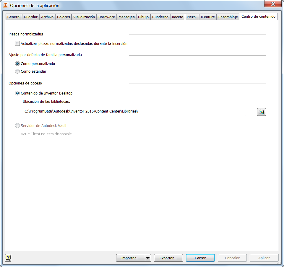 La ubicación por defecto del contenido de Desktop de Inventor es C:\ProgramData\Autodesk\Inventor <versión>\Content Center\Libraries o C:\Documents and Settings\All Users\Application Data\Autodesk\Inventor <versión>\Content Center\Libraries. Puede cambiar esta ubicación por defecto en las Opciones de la aplicación, ficha Centro de contenido. Observe la imagen anterior.