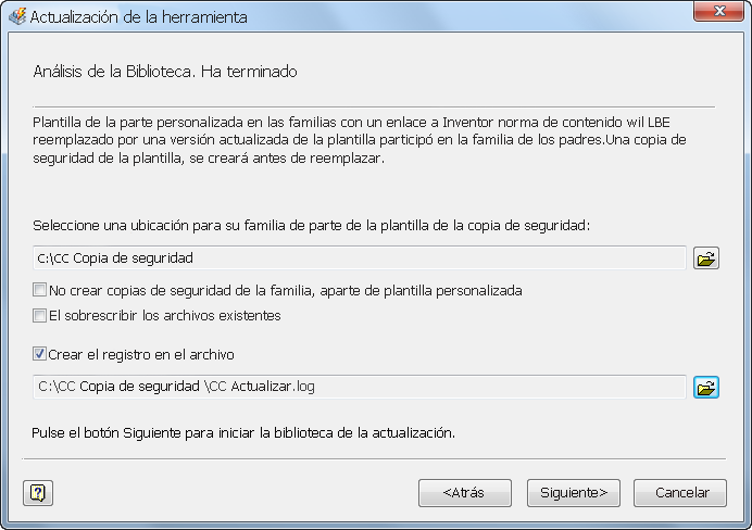 Se lleva a cabo un análisis de las bibliotecas y se muestran los resultados del análisis. Si se detectan problemas, estos deben resolverse para continuar. Si no encuentran problemas, se muestran las opciones de copia de seguridad. Especifique una carpeta para crear una copia de seguridad y haga clic en Siguiente.