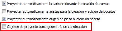 Puede hacer que proyectar geometría como geometría de construcción sea el comportamiento por defecto con la nueva configuración del cuadro de diálogo Opciones de la aplicación en la ficha Boceto: Objetos proyectados como geometría de construcción. Con esta opción seleccionada, no es necesario alternar continuamente el comando Construcción al crear la geometría del boceto. Si esta nueva opción está seleccionada, cada vez que realice una proyección de geometría, esta se proyectará como geometría constructiva. Por defecto, esta opción está desactivada.