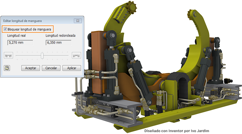 La nueva opción Bloqueo de la longitud de manguera permite calcular un valor exacto de la suma de la longitud de la manguera. Cuando está seleccionada, si se desplazan o cambian los componentes, esta opción evita que la longitud de la manguera se modifique debido a la adaptabilidad.